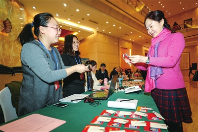1月21日,自治区政协委员陈海荣(右)领取了自己的出席证。政协内蒙古自治区第十二届委员会第一次会议定于1月23日至29日在呼和浩特市召开。从21日起,出席会议的委员陆续到住地报到。内蒙古融媒体记者 于涛 摄