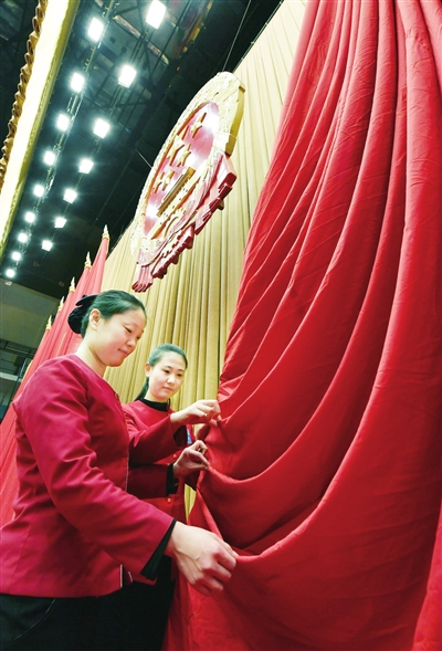 1月21日,在内蒙古人民会堂,工作人员正在布置会场。当日,承接政协内蒙古自治区第十二届委员会第一次会议会务工作的工作人员为会议提供会务保障。 内蒙古融媒体记者 于涛 摄